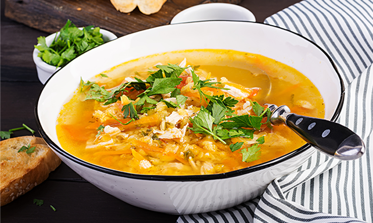 Slepičí polévka – Prověřený pomocník při nachlazení a bolest v krku. Látky obsažené v polévce mají antibakteriální účinky a tlumí infekce horních cest dýchacích.